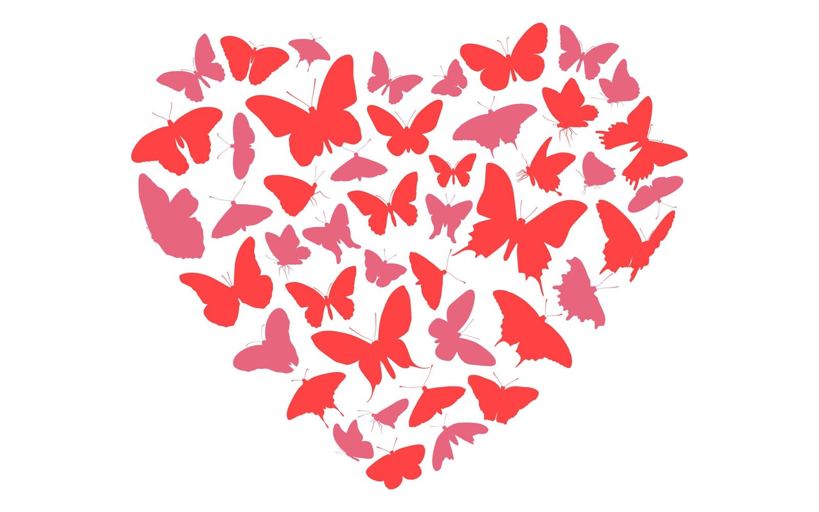 Heart shape composed of various red and pink butterfly silhouettes, symbolizing love and romance in a delicate design.
