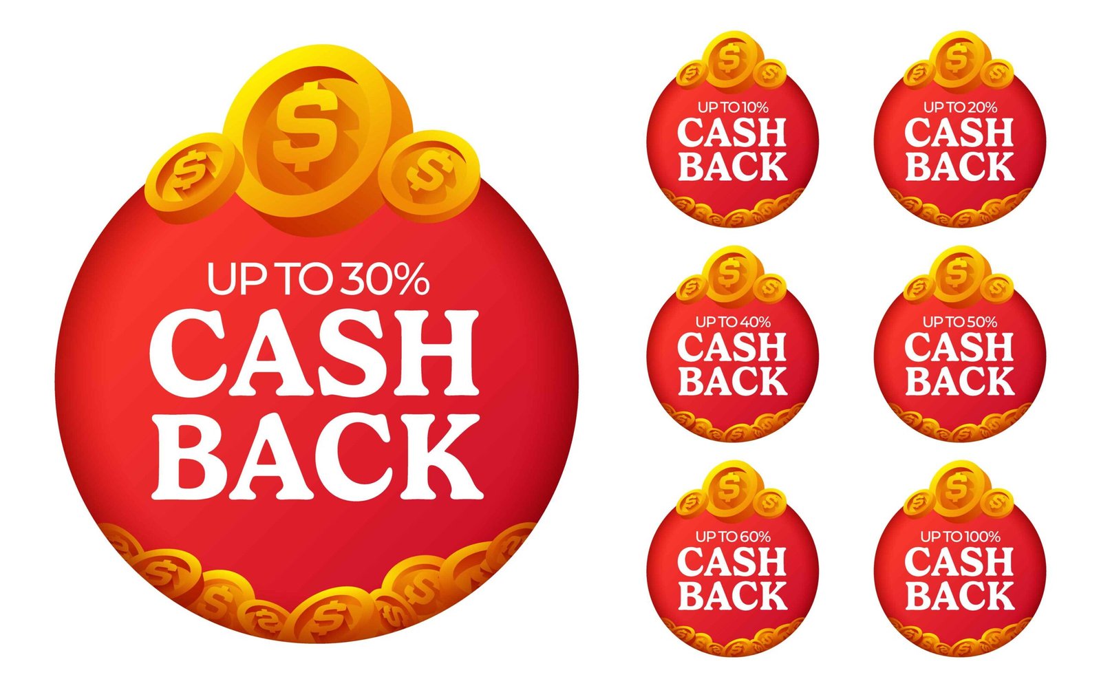 Cash back vector badges set with golden coins and various percentage discounts for promotion and marketing design elements