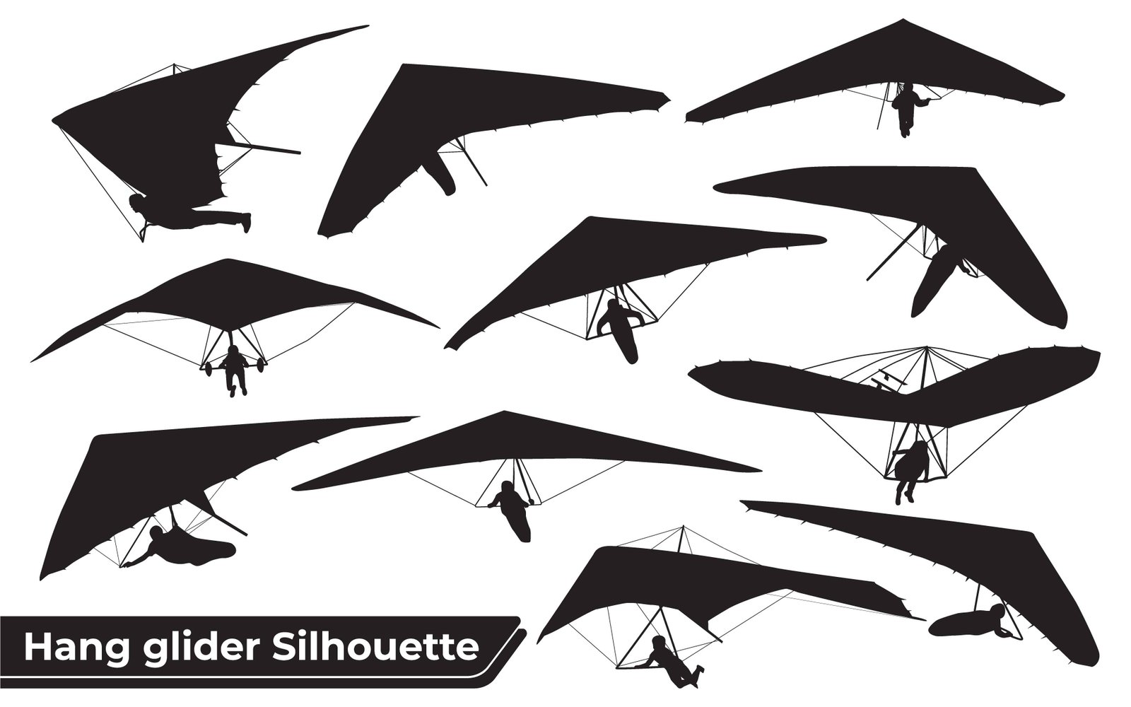 This image presents a comprehensive collection of hang glider silhouettes, rendered in stark black against a clean white or transparent background. The set includes multiple dynamic poses, illustrating various stages and styles of hang gliding, from pilots in an outstretched, prone flight position to others hanging or preparing for takeoff. Each silhouette is sharply defined, emphasizing the distinctive shape of the hang glider wing and the human form in aerial pursuit. This versatile vector collection is ideal for themes related to extreme sports, adventure, freedom, aviation, outdoor activities, and recreational flight. Perfect for graphic design projects, educational materials, websites, banners, and any visual content requiring iconic representations of gliding. It conveys a sense of excitement, independence, thrill, and the freedom of soaring through the sky, making it suitable for a wide range of creative applications.
