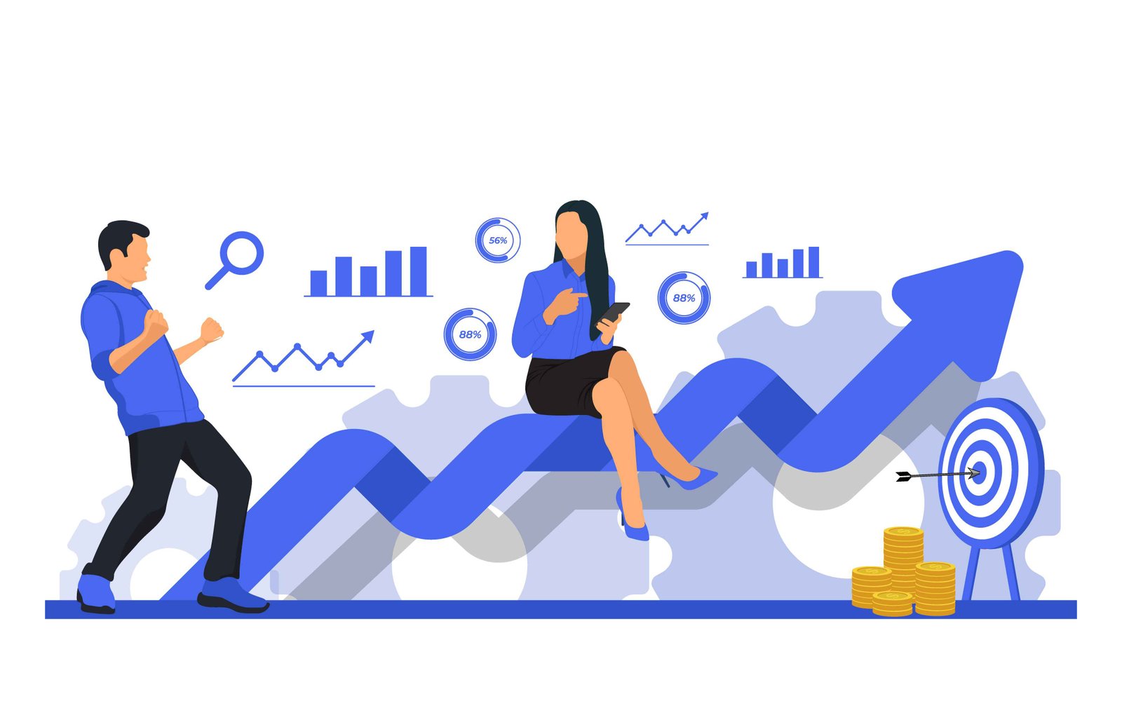 An illustrative scene depicts a dynamic business environment where a diverse team excels in achieving their financial objectives. A jubilant male figure celebrates success, while a focused female professional actively monitors progress on her mobile device, seated confidently on a prominent blue upward-trending arrow. Surrounding them are various analytical elements, including bar charts, line graphs, and percentage indicators, symbolizing data-driven insights and strategic planning. The visual narrative emphasizes growth, successful market penetration, and goal attainment, highlighted by a bullseye target with a direct hit and stacks of gold coins representing financial prosperity. This vector illustration conveys dedication, teamwork, and successful strategic execution in a modern corporate setting, ideal for content related to market growth, investment, and business development.