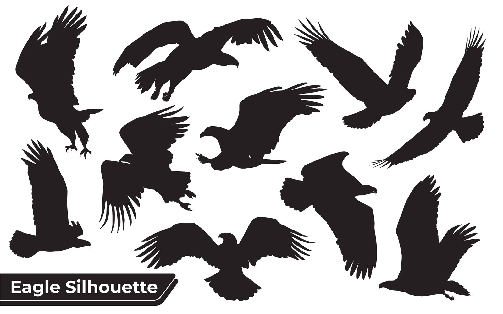 This comprehensive vector illustration showcases a diverse collection of ten distinct eagle silhouettes, each captured in dynamic and powerful flight poses. The set features birds in various stages of soaring, diving, landing, and taking off, providing a versatile resource for numerous design projects. Rendered in crisp, clean black against a stark white background, these graphic elements emphasize the majestic form and impressive wingspan of these iconic raptors. Ideal for logos, emblems, educational materials, environmental themes, patriotic designs, or any visual communication requiring a strong symbol of strength, freedom, and vision. The sharp, detailed outlines offer high adaptability for scaling and customization, making this a perfect asset for graphic designers, educators, and content creators. Each silhouette is thoughtfully composed to convey movement and grace, reflecting the natural predatory elegance of these magnificent birds of prey, representing power.