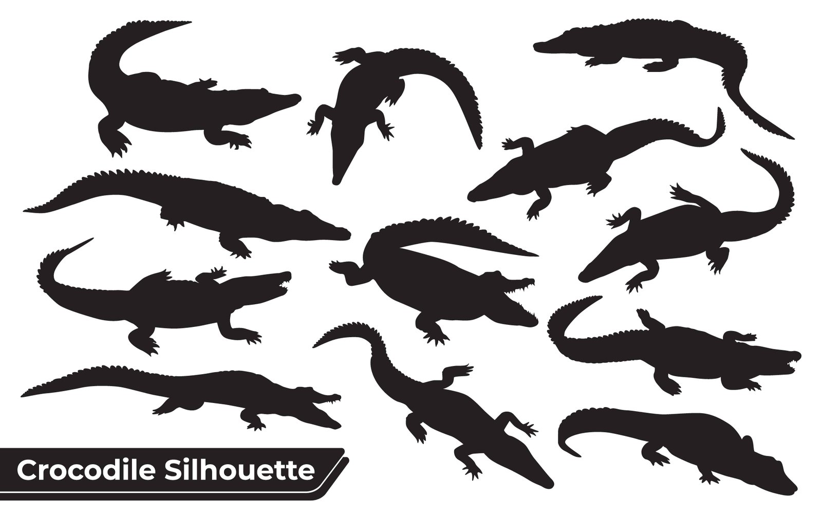 A comprehensive vector collection showcasing diverse crocodile and alligator silhouettes. This extensive set features multiple predatory reptiles in various dynamic poses, including top-down views, side profiles, and menacing open-mouth postures, offering a wide array of options for creative projects. Ideal for a wide range of design projects, wildlife themes, educational materials, logos, mascots, and nature-inspired graphics. Each silhouette is sharp, clean, and easily scalable for maximum versatility across digital and print media. Perfect for illustrating concepts of danger, power, wilderness, and the animal kingdom with a striking visual impact. These iconic shapes represent primal strength, fierce determination, and the untamed beauty of nature, making them invaluable for designers seeking compelling animal graphics.
