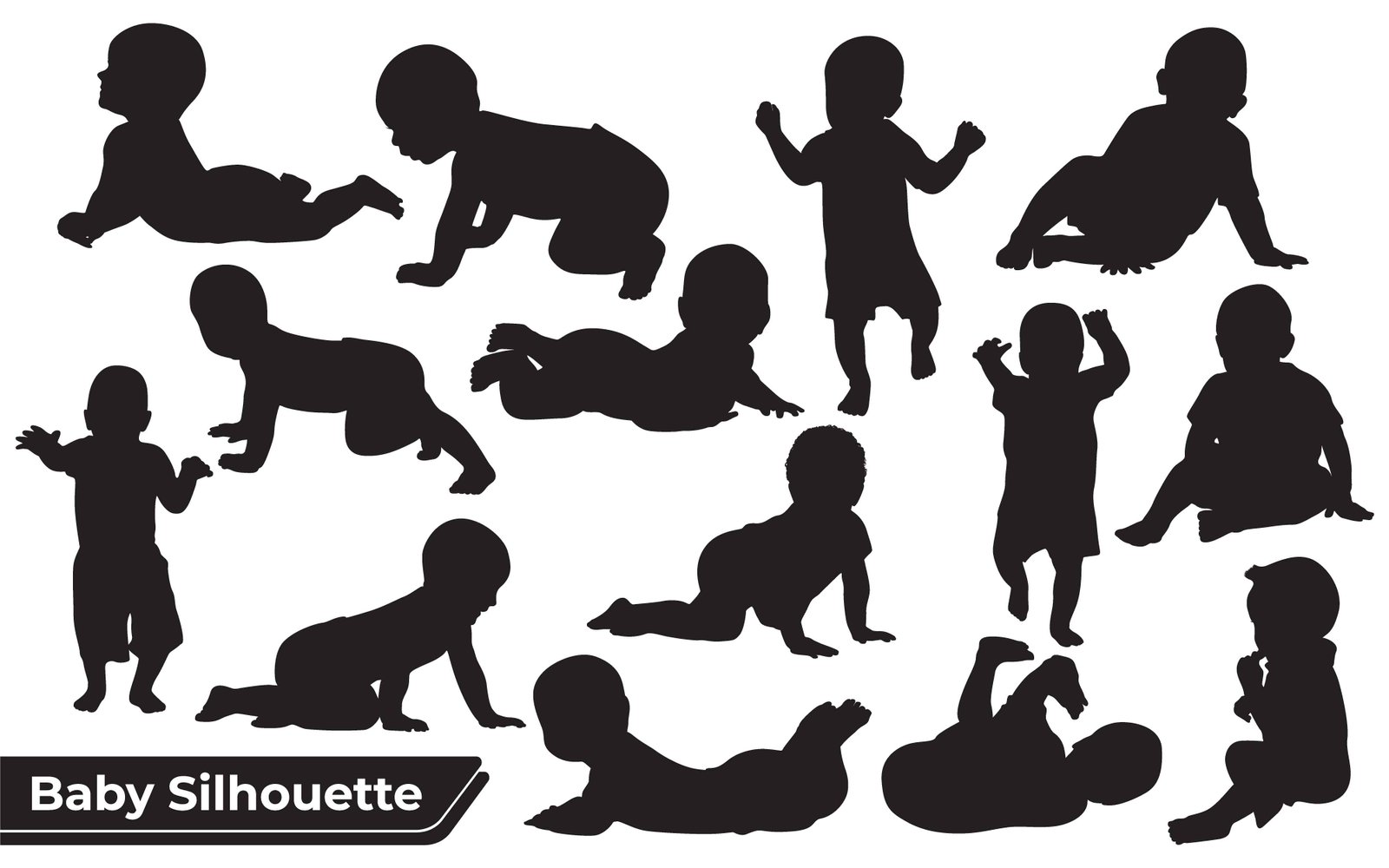 A collection of black baby silhouettes illustrating different developmental milestones from crawling to standing and playing. These diverse poses capture the essence of early childhood movement and exploration.