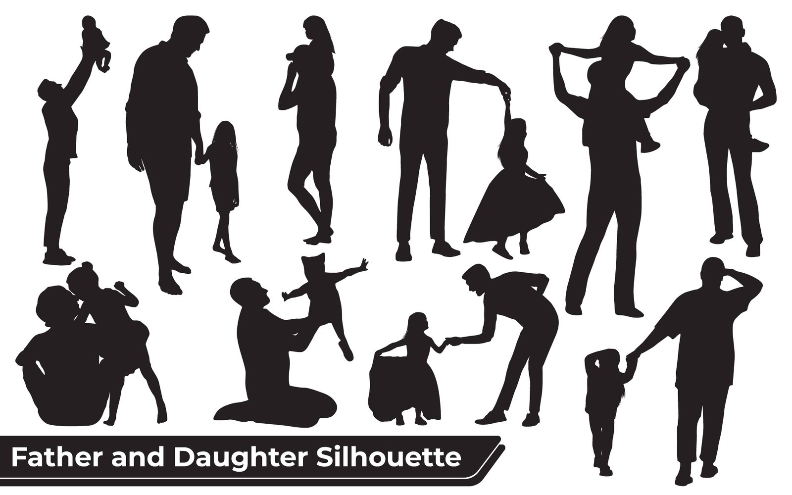 A comprehensive collection of father and daughter silhouettes showcasing various heartwarming interactions and emotional bonds. This versatile vector illustration features multiple poses, including a father holding his daughter’s hand, carrying her on his shoulders, playing together, and sharing tender moments. Each silhouette captures the essence of family life, childhood joy, parental love, and the unique connection between a father and his girl. Ideal for projects related to family dynamics, parenthood, childhood development, strong relationships, and the special journey of growing up with a supportive father figure. The diverse set offers flexibility for design applications, illustrating different stages and activities in a father-daughter relationship. Perfect for educational materials, advertising, greeting cards, and website graphics emphasizing familial love and connection. The clean, crisp outlines ensure high adaptability and visual impact in any design context.