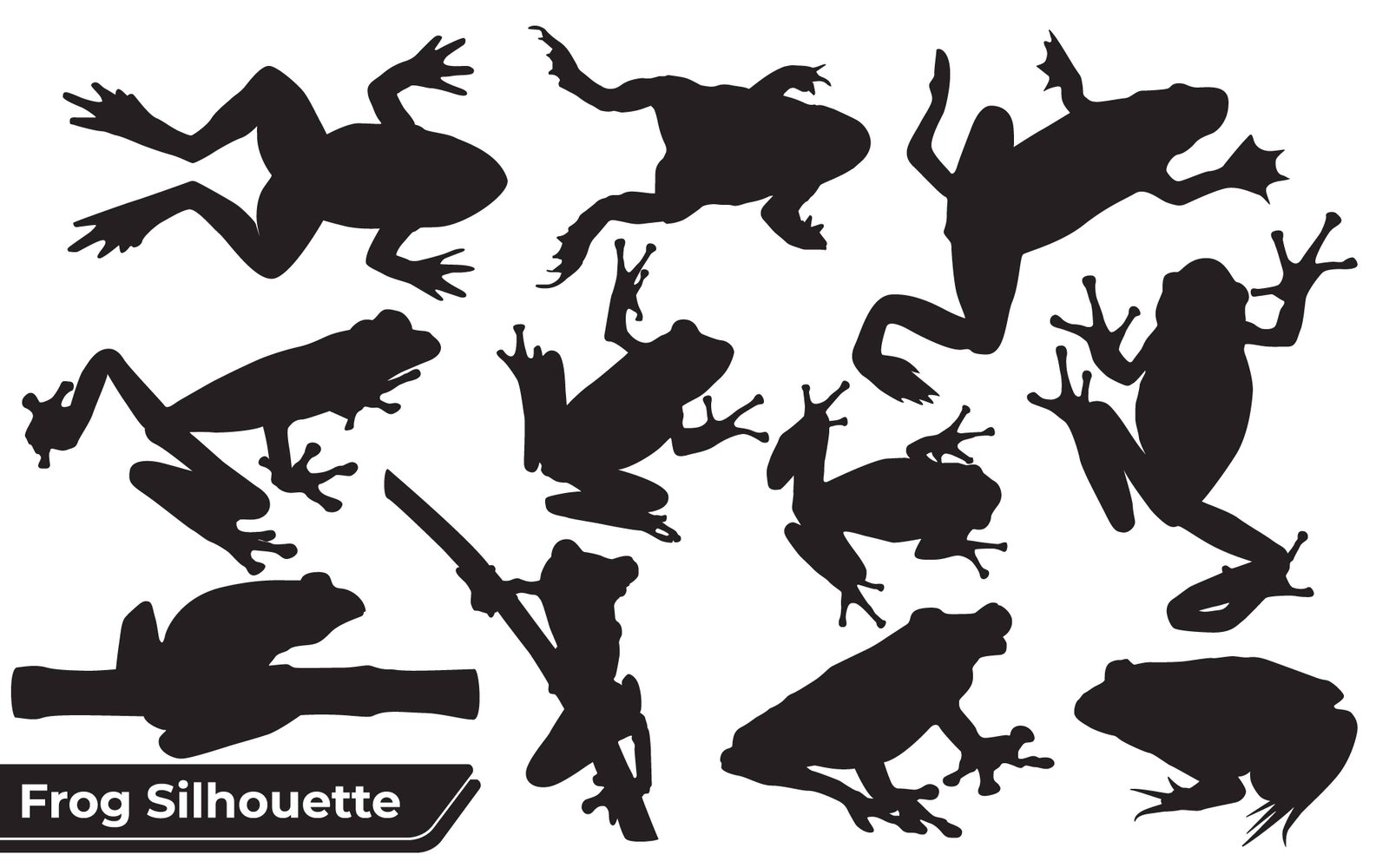 This comprehensive vector illustration features a diverse collection of frog silhouettes, each meticulously designed to showcase various poses and actions characteristic of amphibians. The set includes frogs sitting, leaping, climbing, and resting, offering a wide range of dynamic and static representations. Ideal for graphic design projects, educational materials, natural history displays, children’s books, eco-tourism promotions, and wildlife-themed branding. The clean, crisp lines ensure versatility for scaling and printing. Perfect for projects needing versatile amphibian imagery. The collection provides an excellent resource for designers seeking high-quality, scalable graphics representing these fascinating creatures of nature. This adaptable asset is ready for any creative endeavor requiring iconic frog imagery, emphasizing their natural movements and forms vividly.