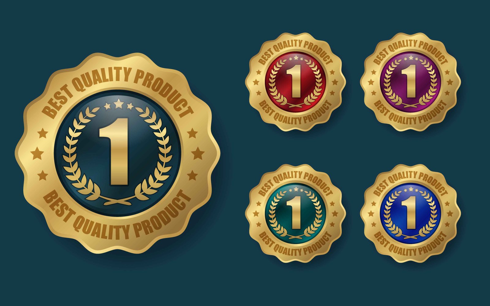 A set of five ornate golden badges, each prominently displaying the numeral ‘1’. The largest badge, on the left, has a laurel wreath and text indicating ‘Best Quality Product’.