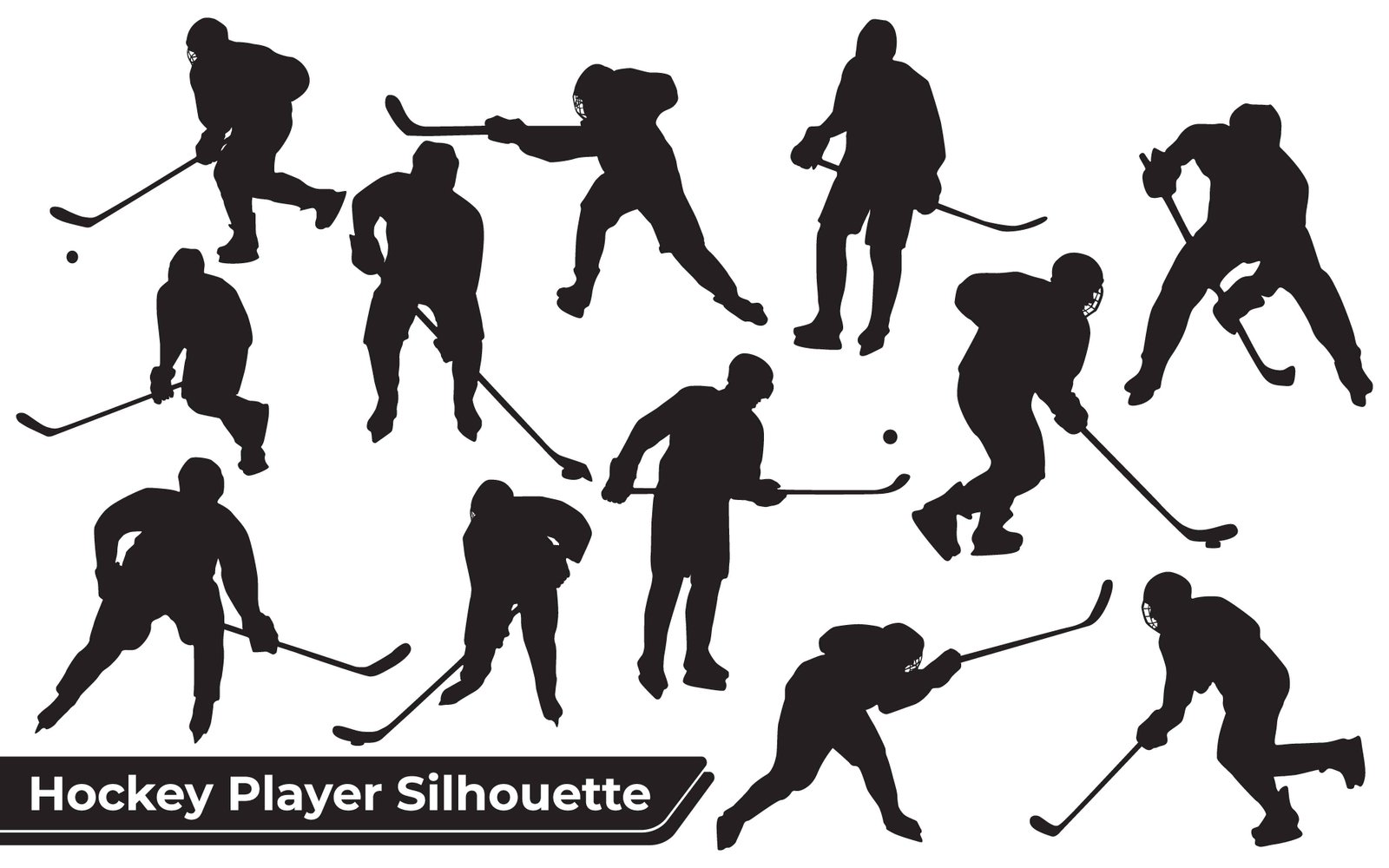 A comprehensive vector collection featuring numerous ice hockey player silhouettes captured in various dynamic action poses. Each figure depicts a player actively engaged in the sport, including skating, shooting, passing, and defending, showcasing the intense energy and skill required for this popular game. These versatile graphics are perfect for sports-related designs, merchandise, advertisements, event promotions, website elements, or educational materials. The clean, solid black shapes against a light background provide high contrast and adaptability for different creative projects, emphasizing athleticism, teamwork, and competitive spirit in winter sports and professional competition.