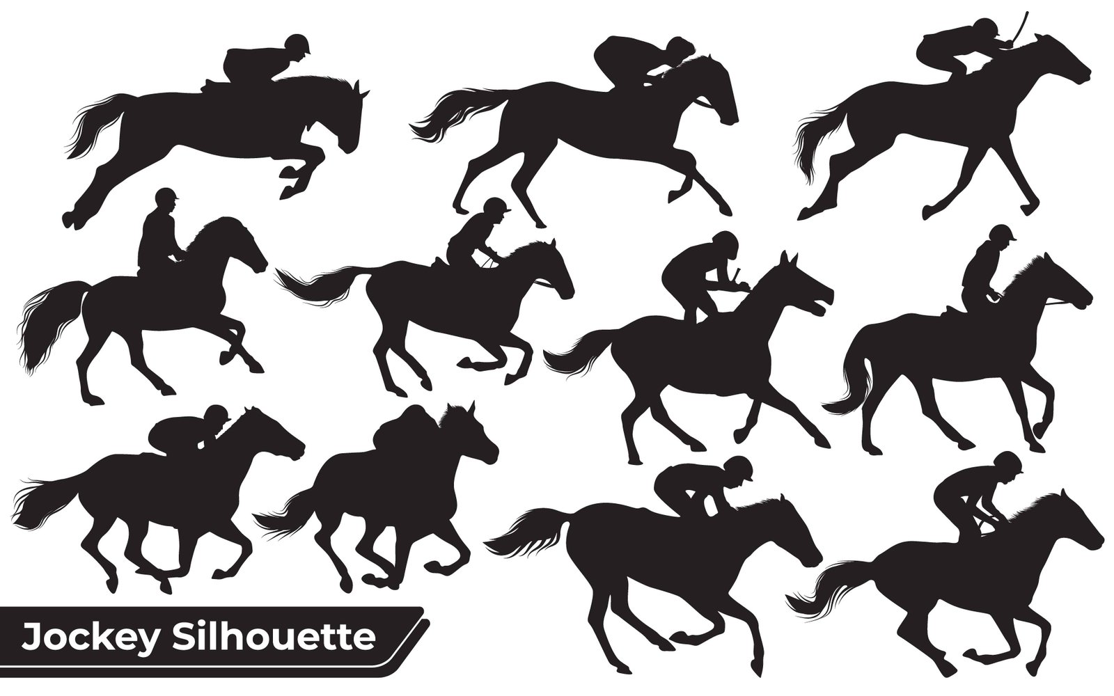 A comprehensive collection of dynamic vector silhouettes featuring jockeys and horses in various action poses. This set vividly captures the essence of horse racing and equestrian sports, showcasing galloping horses, intense competition, and impressive jumps. Each silhouette is meticulously crafted to convey motion, speed, and the powerful bond between rider and animal. Ideal for sports-related designs, event promotions, website graphics, print materials, and educational content. The isolated elements allow for versatile integration into any project requiring a strong visual impact with a clean, graphic style. Perfect for themes related to athleticism, victory, speed, and equestrian events.