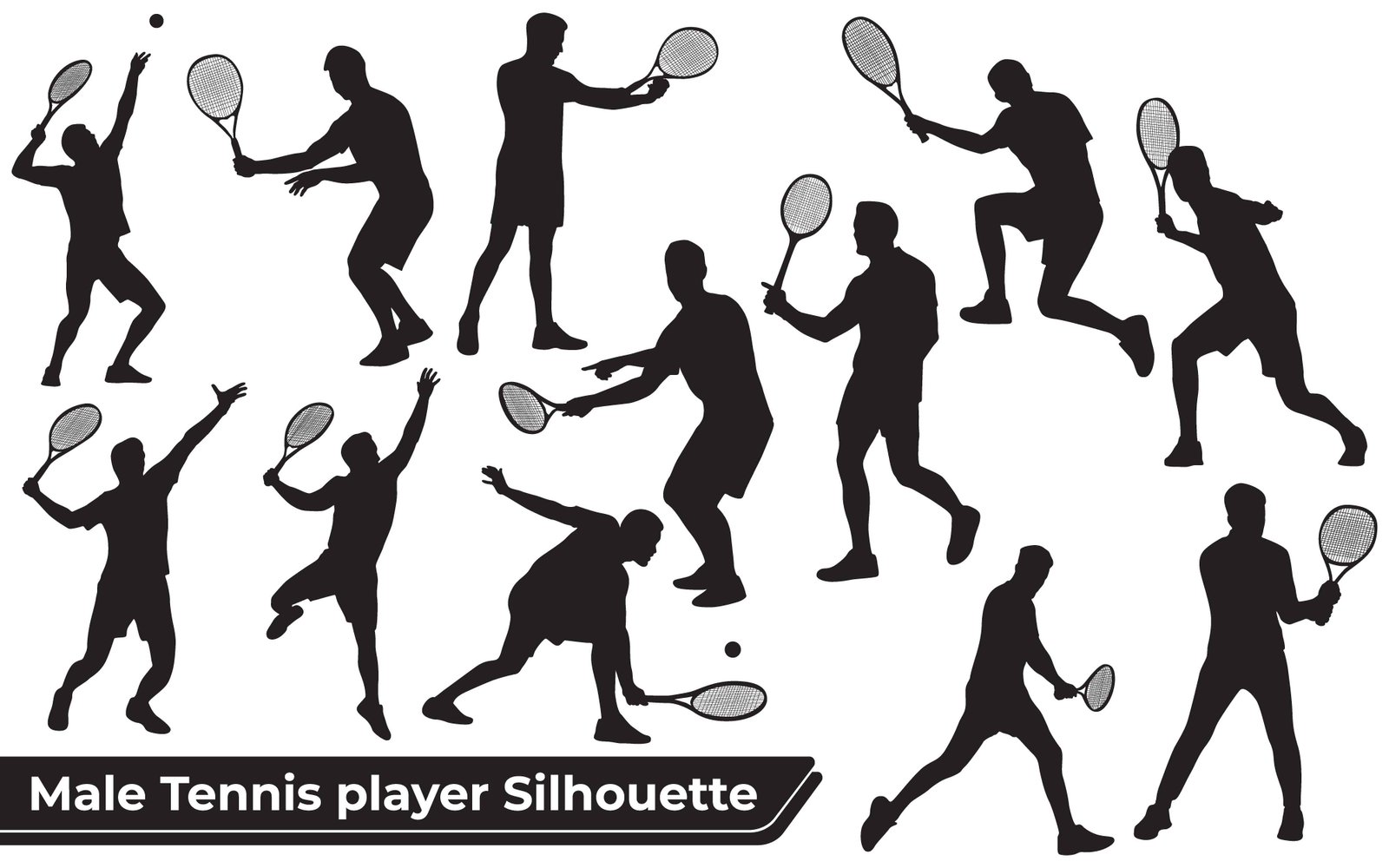 This image presents a comprehensive collection of male tennis player silhouettes, showcasing a wide array of dynamic action poses. Each figure is expertly rendered in stark black against a clean white background, highlighting the athletic movement and intensity of the sport. The collection includes various stages of gameplay, such as serving, forehand and backhand swings, volleys, and groundstrokes, capturing the agility, speed, and precision required in tennis. Ideal for sports graphics, promotional materials, website designs, or any project needing versatile vector representations of male athletes in action. This versatile set offers ready-to-use elements for illustrating competitive sports, fitness, and active lifestyles with professional graphic appeal.
