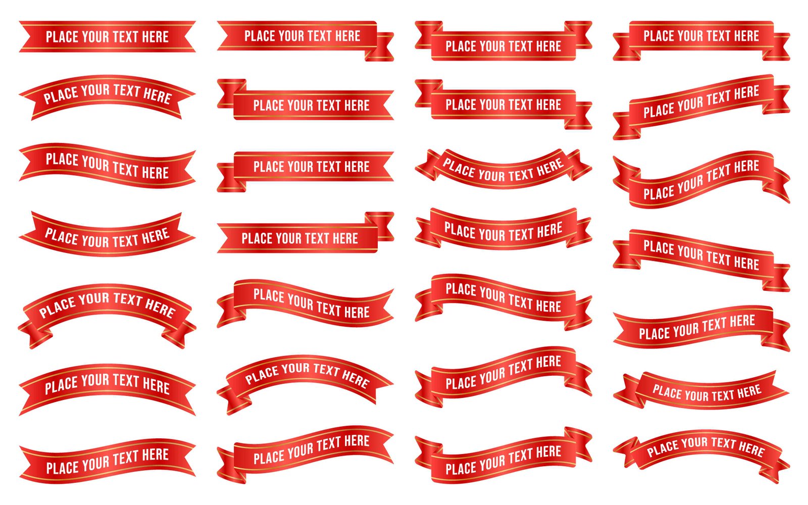 A comprehensive vector illustration showcasing a diverse collection of red vintage ribbons, each adorned with an elegant golden border. This versatile set features various classic and modern ribbon shapes, including banners, scrolls, and curved designs, all designed to hold customizable text. Ideal for adding a touch of classic sophistication to announcements, sales promotions, certificates, special offers, labels, badges, or decorative elements in any digital or print design project. The clean, crisp lines and rich red hue make these elements perfect for festive, celebratory, or formal themes, offering ample space for personalized messages and creating visually appealing graphical accents with ease and style.