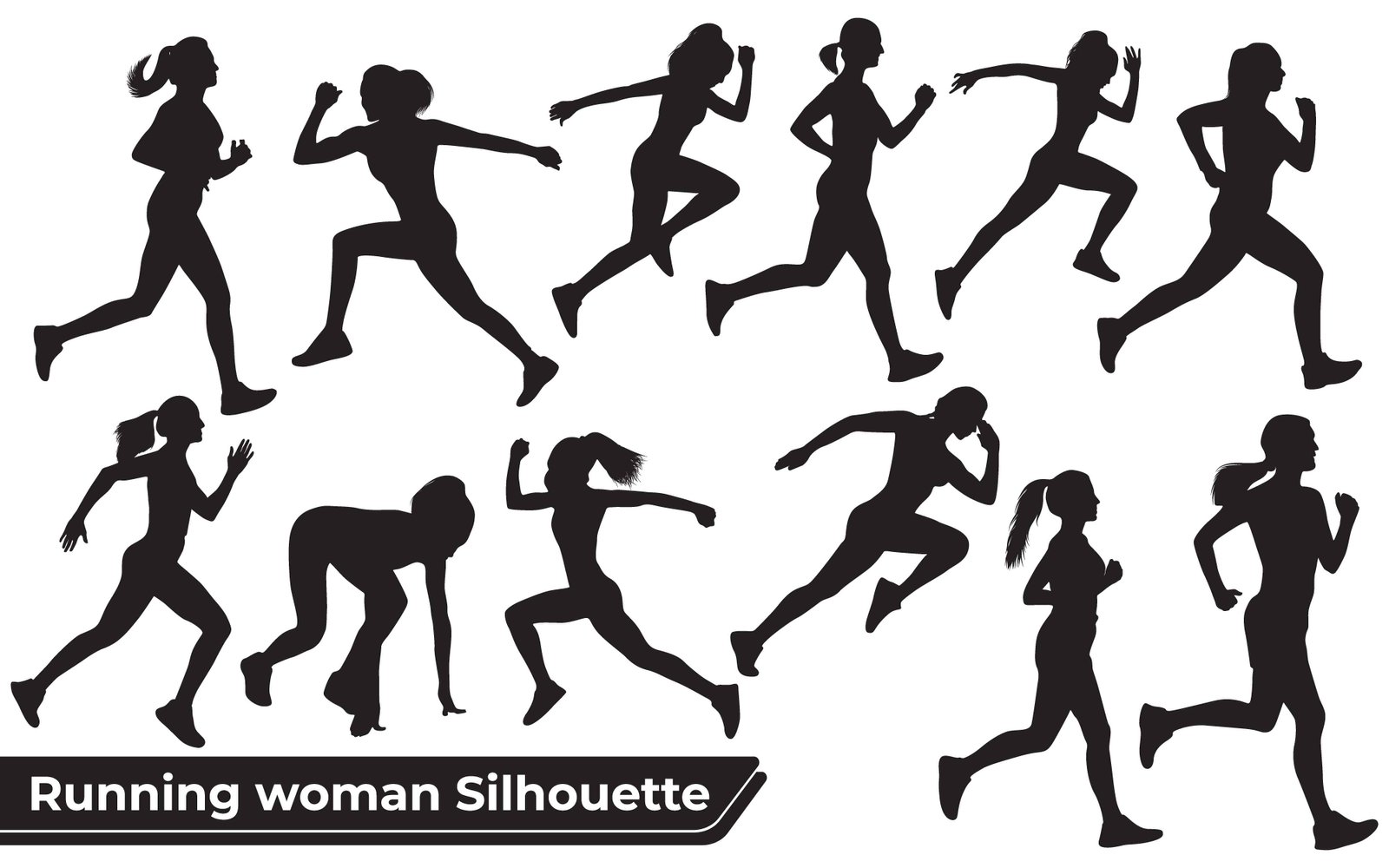 A comprehensive collection of dynamic female runner silhouettes, showcasing women engaged in various active poses like running, jogging, and stretching. This versatile vector set is perfect for conveying themes of fitness, athleticism, health, endurance, and an active lifestyle. Each silhouette captures movement and energy, making them ideal for sports-related design projects, advertisements for gyms or fitness brands, marathon event promotions, or any creative endeavor emphasizing female empowerment and physical activity. The isolated figures on a clean background offer flexibility for diverse graphic applications, highlighting determination and progress in sports and training.