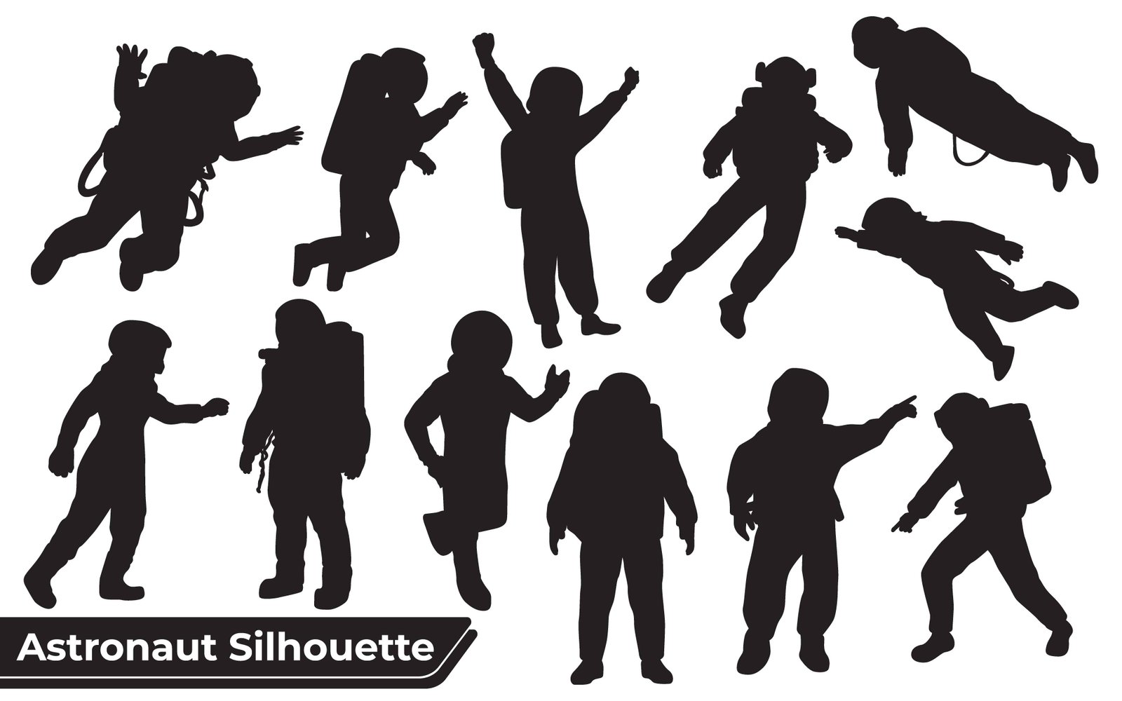 A diverse set of black astronaut silhouettes showcases different actions, from jumping and reaching to floating and running, capturing the essence of space travel and weightlessness in a graphic illustration.