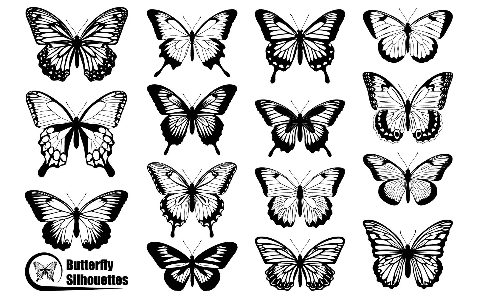 This comprehensive collection showcases a variety of intricately designed black and white butterfly silhouettes. Each unique illustration features distinct wing patterns and body shapes, representing different species of butterflies. The clean, crisp lines and sharp contrasts make these vector graphics highly versatile for a wide range of creative projects. Ideal for use in logos, web design, print media, educational materials, textile patterns, or as decorative elements. The isolated nature of these designs ensures easy integration into any layout, providing elegant and natural aesthetic touches to your visual compositions. Perfect for adding a touch of nature-inspired beauty to any design endeavor, offering timeless and sophisticated visual appeal. These versatile images are ready for immediate deployment in diverse applications, enhancing graphic output with grace and precision.