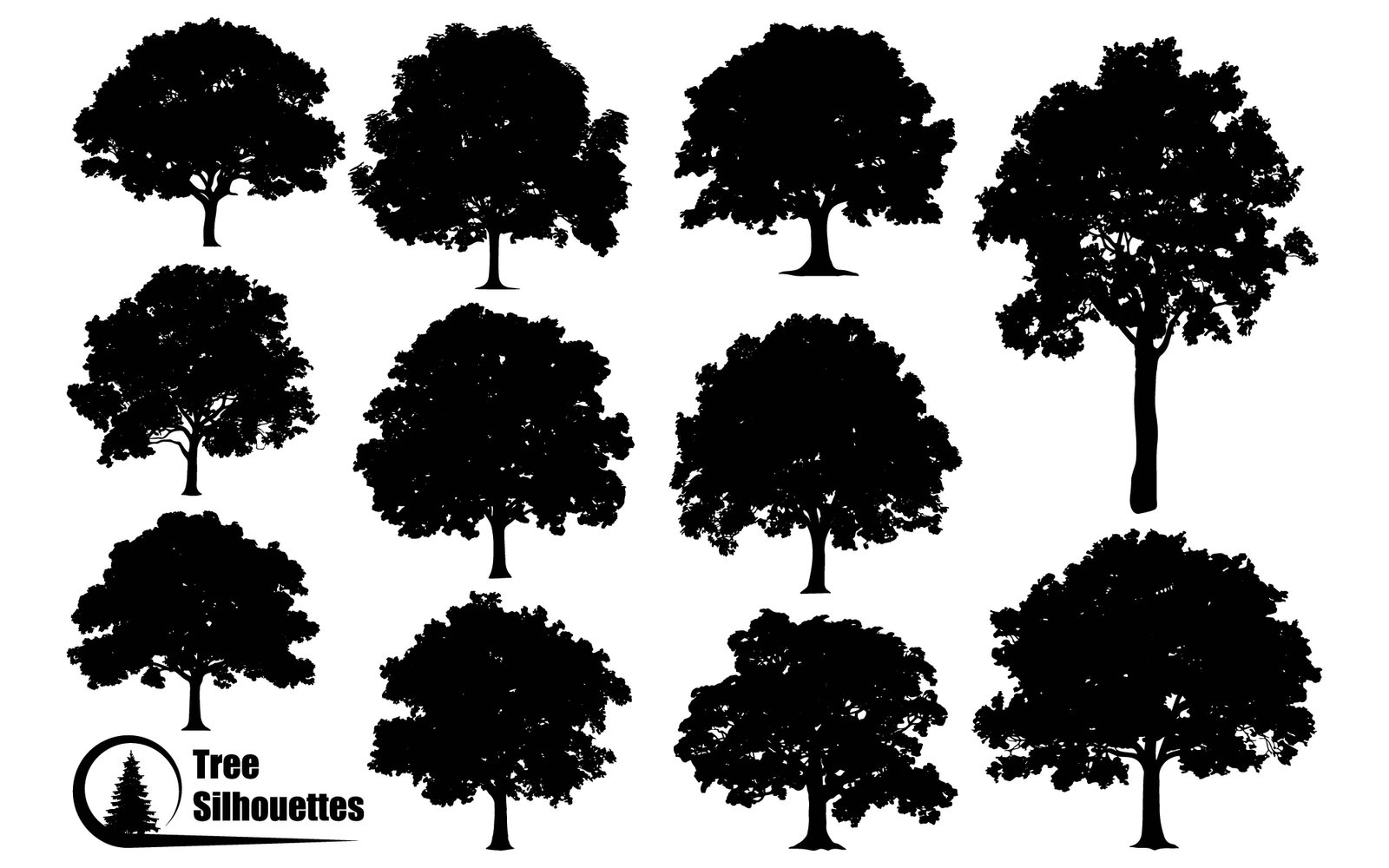 This image presents a comprehensive collection of diverse tree silhouettes, meticulously crafted for versatility in various design applications. Each silhouette features unique foliage and trunk structures, offering a rich assortment from slender saplings to mature, robust trees. Ideal for architectural renderings, landscape planning, graphic design projects, environmental studies, and urban development visualizations. The crisp, clean lines and distinct shapes ensure seamless integration into digital and print media. This set provides essential elements for creating realistic or stylized natural environments, conveying themes of growth, nature, sustainability, and green spaces effectively across numerous creative endeavors. The isolated nature on a white background ensures easy extraction and use. It serves as a vital resource for designers.