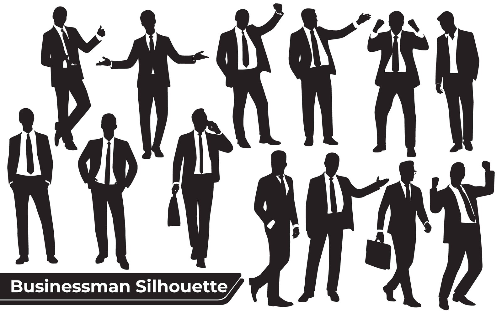This comprehensive vector set features a diverse range of businessman silhouettes, each depicted in a unique and professional pose. The collection includes figures standing, walking, gesturing, talking on the phone, and expressing various corporate actions and emotions. Designed with a clean, crisp aesthetic, these high-quality graphics are perfect for a wide array of business-related projects, presentations, websites, and marketing materials. They convey professionalism, dynamism, and versatility, making them an essential asset for designers and content creators seeking impactful visual elements to represent the corporate world, office environments, and professional interactions efficiently.