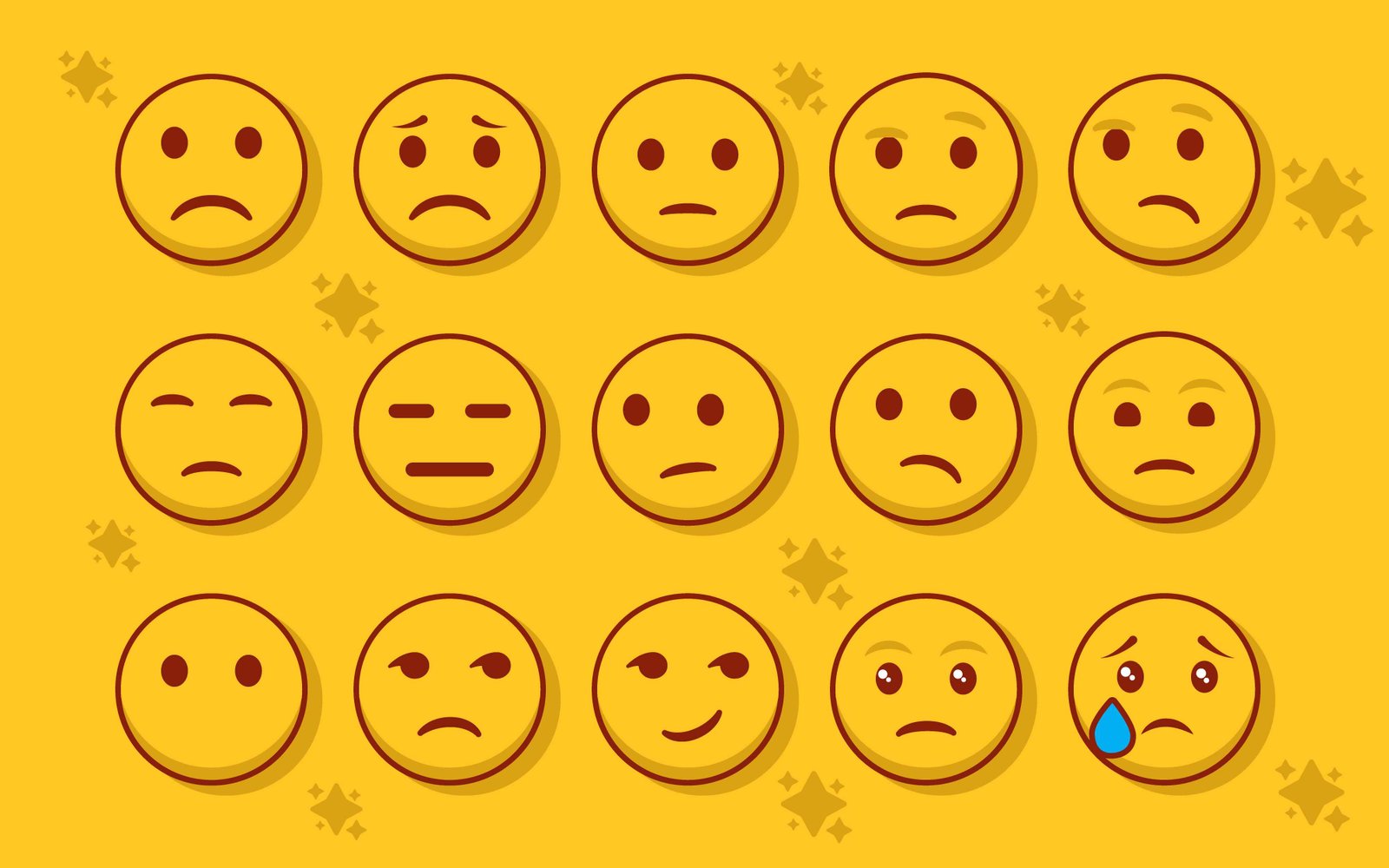 This illustration features a comprehensive collection of yellow circular emoticons, primarily depicting a range of negative and neutral emotions. The set includes expressions of sadness, disappointment, frustration, neutrality, and one emoticon with a tear representing crying. Arranged in a clean grid on a vibrant yellow background with subtle star accents, these vector icons are designed in a modern, flat style with thin outlines and soft shadows, creating a clean and appealing aesthetic. This versatile collection is ideal for various applications such as customer satisfaction surveys, user experience feedback interfaces, emotional response ratings, website design elements, mobile application development, educational materials, and presentations where conveying a spectrum of less-than-positive human emotions is crucial. The isolated nature of these digital assets allows for easy integration into diverse design projects, making them perfect for communicating nuanced feelings without words. This graphic effectively represents user dissatisfaction or an indifferent mood, making it suitable for sentiment analysis visuals.