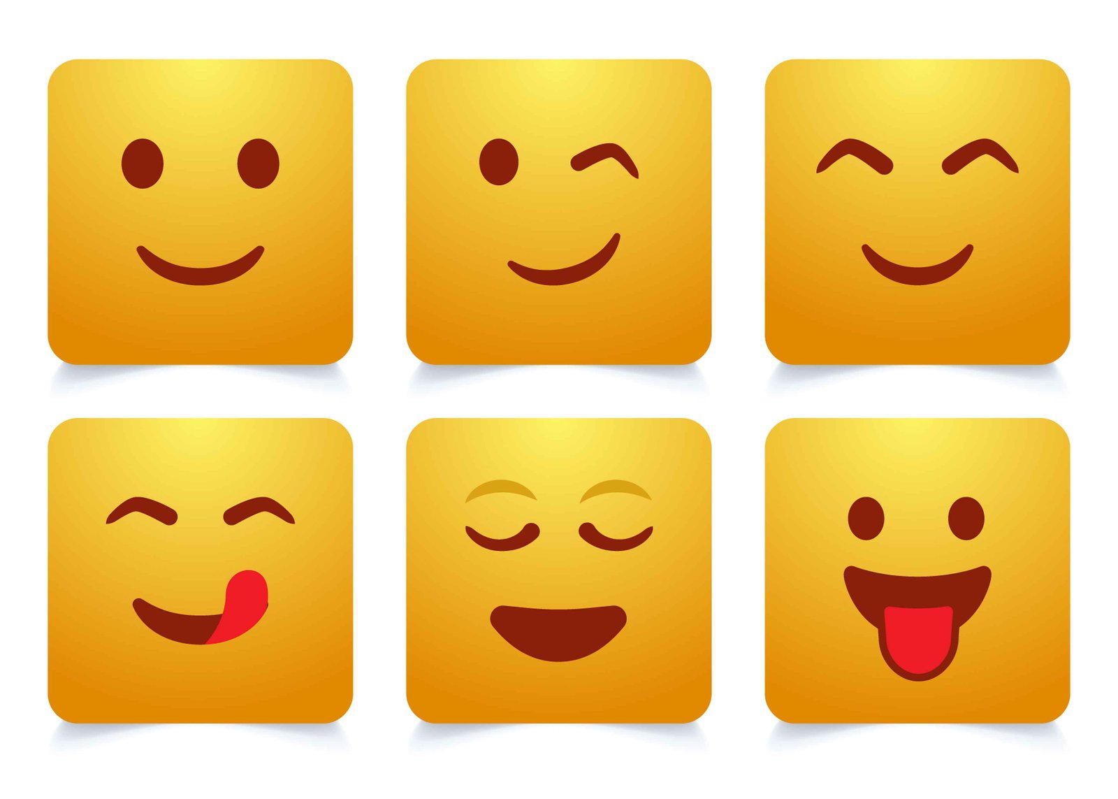 This vibrant collection features six distinct yellow, rounded square emoji icons, each showcasing a unique and positive facial expression. The set includes a classic happy smile, a playful wink, eyes closed in serene contentment, an expression of anticipation with licking lips, a relaxed face with closed eyes, and a cheerful face playfully sticking out its tongue. These versatile graphic elements are perfect for conveying a wide range of emotions and sentiments in digital communication. Ideal for social media platforms, mobile applications, website user interfaces, instant messaging, chat functions, and various graphic design projects, they enhance user interaction and add a touch of personality. The clean, modern design makes them suitable for enhancing user experiences, providing visual feedback, or simply adding a friendly and approachable feel to any digital product or online content. This collection effectively symbolizes positive feelings, reactions, and the dynamic nature of online expression, making it an essential asset for modern digital storytelling.