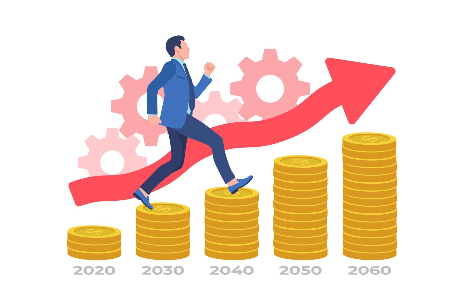 An illustrative representation of long-term financial growth and investment strategy, depicting a determined businessman ascending a staircase of increasing coin stacks. Each stack represents a decade from 2020 to 2060, symbolizing consistent accumulation of wealth over time. A prominent red arrow points upwards, signifying continuous progress and positive market trends, while subtle gear elements in the background hint at systematic processes driving this success. This vector image effectively conveys concepts of future planning, retirement savings, wealth management, career progression, and sustained economic development. It is ideal for financial advisories, investment firms, wealth management companies, educational materials on personal finance, and corporate presentations focusing on growth projections, strategic planning, or employee benefits. The clear, isolated composition ensures versatility for various digital and print applications, emphasizing upward mobility and a successful financial journey.