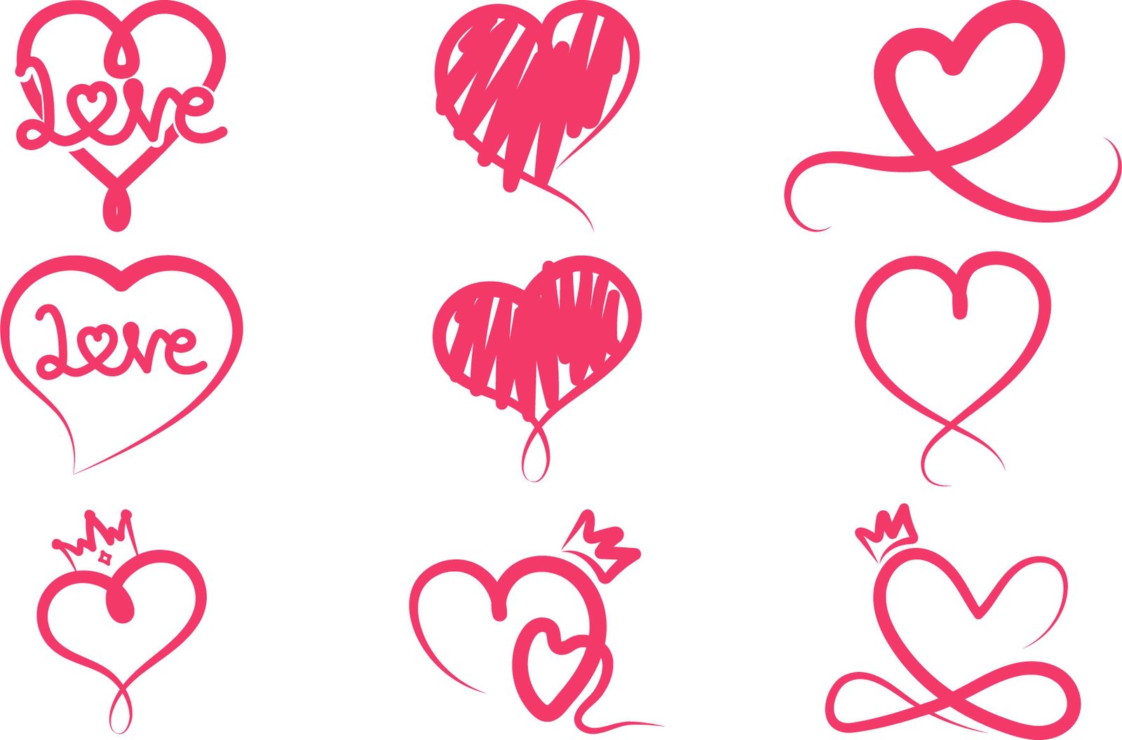 A charming collection of nine distinct hand-drawn pink heart vector illustrations, ideal for conveying themes of love, romance, and affection. This diverse set features various artistic styles, including scribbled textures, elegant flowing lines, hearts adorned with delicate crowns, and designs subtly incorporating the word ‘Love’. Each graphic is crafted with a whimsical, doodle-like aesthetic, making them perfect for a wide range of creative projects. Use these versatile elements for Valentine’s Day designs, wedding invitations, anniversary cards, social media graphics, romantic event promotions, or any project requiring heartfelt decorative accents. The vibrant pink hue symbolizes passion and joy, making this bundle a lovely resource for designers seeking expressive and charming visual assets. These scalable vector elements ensure high-quality reproduction across all media, from digital platforms to print materials, enhancing any design with a touch of warmth and sincerity. The unique blend of traditional heart shapes with modern, expressive renditions offers creative flexibility. Perfect for conveying deep emotional connections and celebratory feelings in a visually appealing manner.