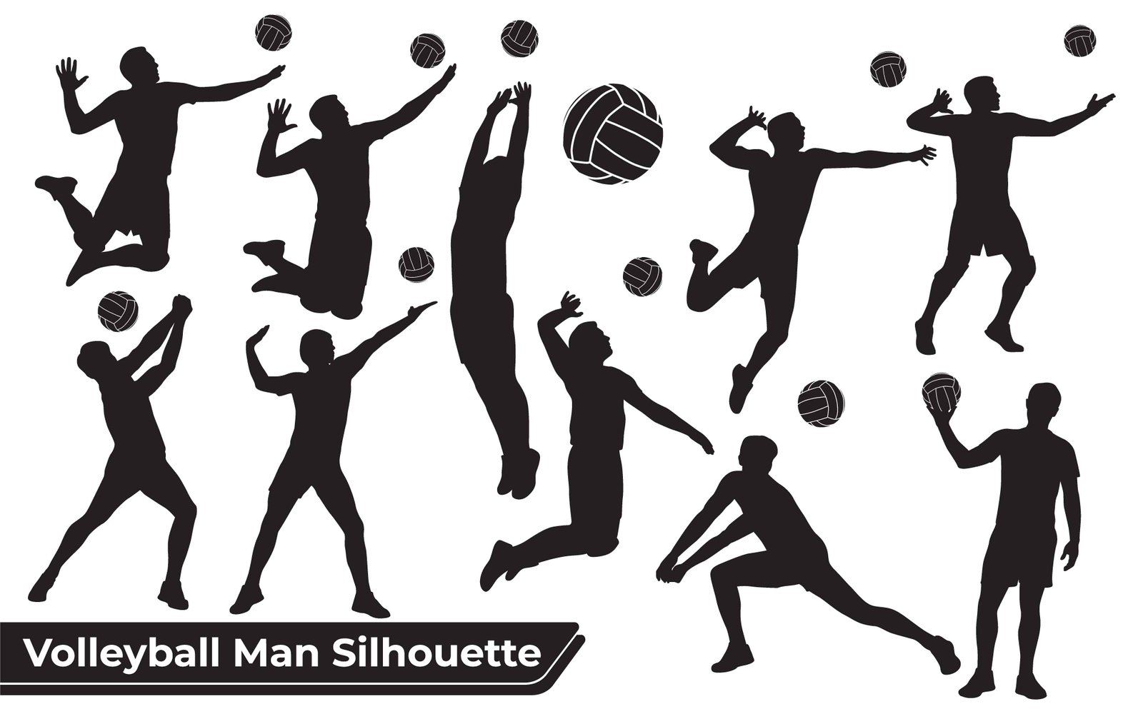 A comprehensive collection of male volleyball player silhouettes, showcasing various dynamic actions like serving, spiking, blocking, diving, and setting. Each figure is depicted in a clear, sharp silhouette, emphasizing movement and athletic prowess. The isolated figures are ideal for sports event promotions, team branding, graphic design projects, website elements, fitness advertisements, and educational materials. This versatile vector set captures the energy and skill required in competitive volleyball, providing a clean and impactful visual resource for designers and marketers seeking sports-related imagery. The collection offers diverse poses suitable for conveying high-energy gameplay and individual player contributions to the team sport, perfect for illustrating the essence of competitive volleyball action.