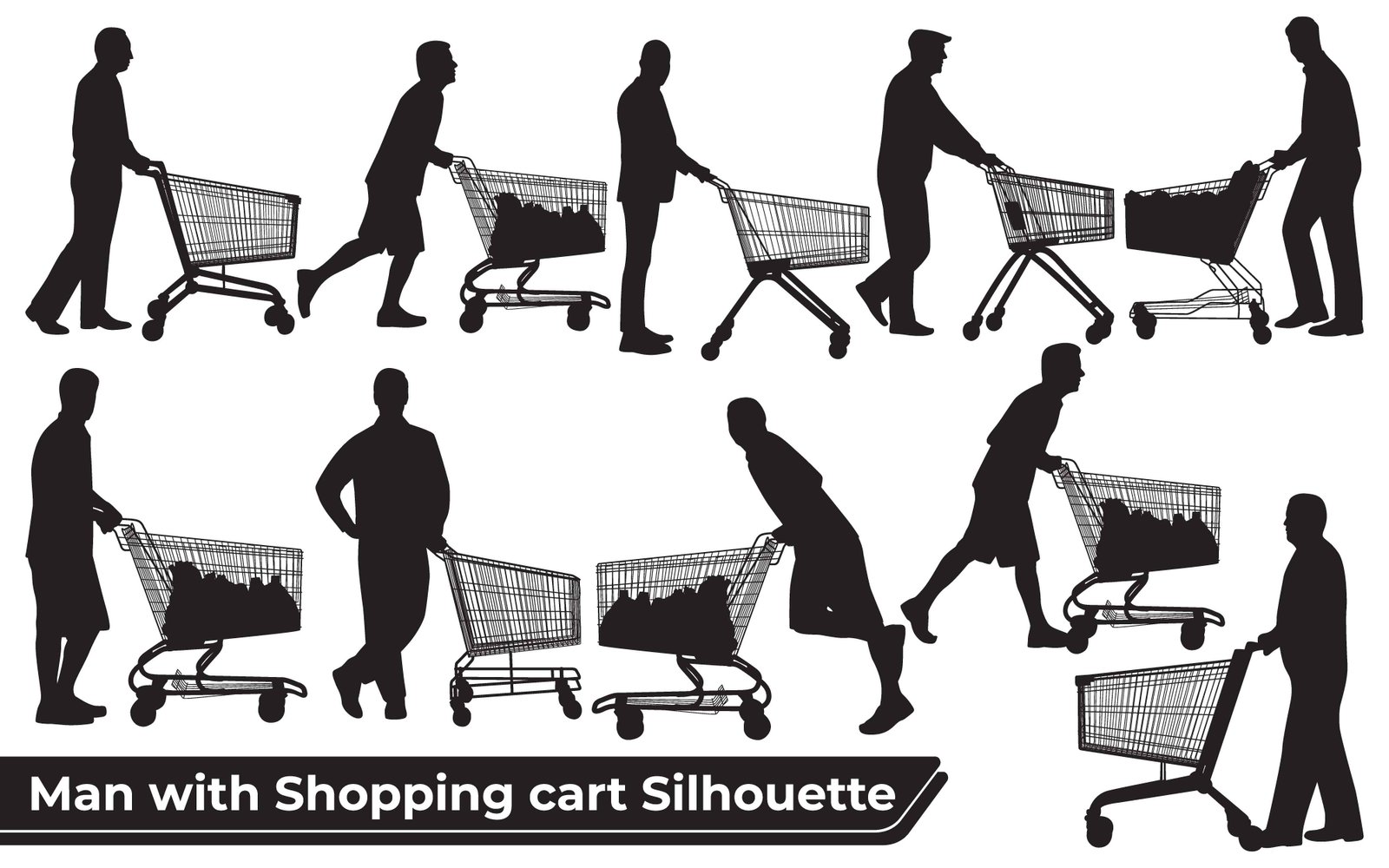 This image features a comprehensive set of male silhouettes interacting with shopping carts, captured in various dynamic poses. The collection illustrates a range of activities including pushing, running, walking, pointing, and leaning, conveying diverse shopping experiences and consumer behaviors. These versatile vector illustrations are ideal for design projects related to retail, consumerism, commerce, sales, discounts, supermarket themes, purchasing, and marketing. The isolated figures against a clear background offer flexibility for easy integration into advertisements, infographics, presentations, or web design, emphasizing action and engagement in a shopping environment. This graphic resource is perfect for conveying concepts of retail activity, customer journey, promotion, and modern lifestyle. The minimalist style ensures broad applicability across various media. A great visual for any retail or consumer-focused project.
