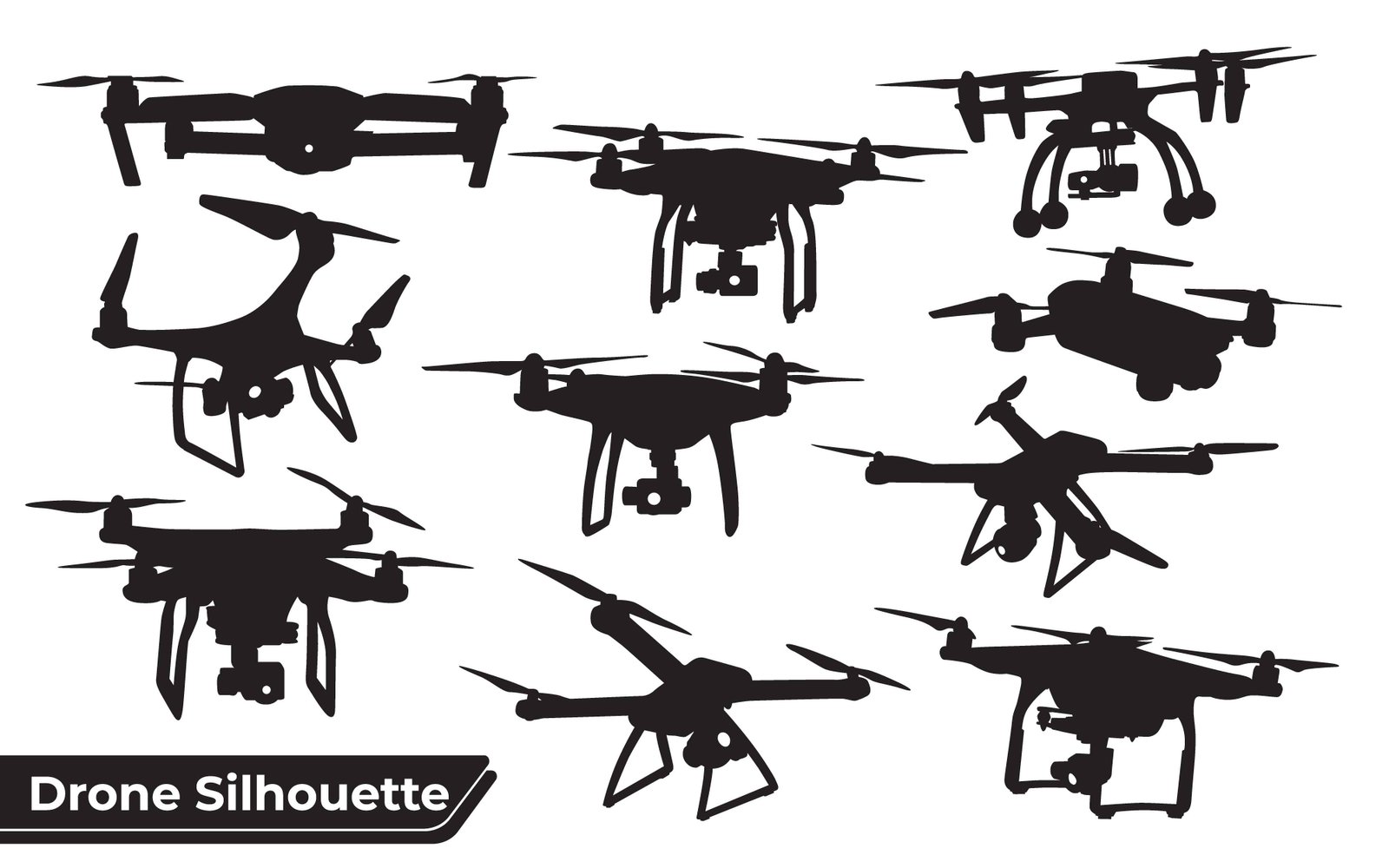 This extensive vector illustration presents a comprehensive collection of modern drone silhouettes, showcasing a wide array of unmanned aerial vehicles (UAVs) in various dynamic poses and configurations. Each distinct silhouette highlights the diverse designs and technological advancements found in contemporary aerial devices, many equipped with integrated cameras or landing gear. This versatile graphic is perfect for illustrating concepts related to aerial photography, videography, mapping, surveillance, package delivery, and recreational flight. It captures the essence of innovation, automation, and the future of remote-controlled technology across industries, from commercial applications to personal hobbies and professional media production. The clean, crisp outlines offer exceptional versatility for graphic design projects, presentations, web assets, and educational content, emphasizing the evolving landscape of airborne technology.