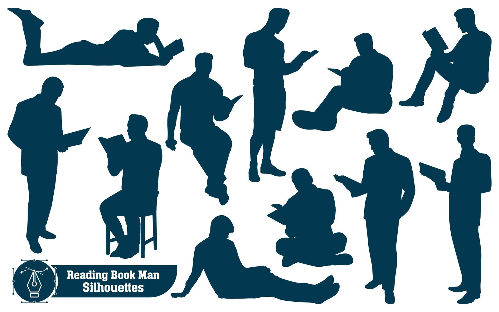 This comprehensive vector collection features diverse male silhouettes engaged in various reading activities. Men are depicted standing, sitting, walking, and reclining, all deeply immersed in books, tablets, or smartphones. This versatile set includes individuals focused on learning, studying, and absorbing information. Ideal for projects related to education, literacy, technology, lifestyle, and leisure. The crisp, clean outlines provide versatile visual assets for websites, presentations, posters, and print media, conveying concepts of knowledge acquisition, relaxation, and modern information consumption. The figures represent different ages and styles, making this a widely applicable graphic element for a broad range of design needs, emphasizing engagement with content in various everyday scenarios and environments. It is perfect for editorial and commercial use.