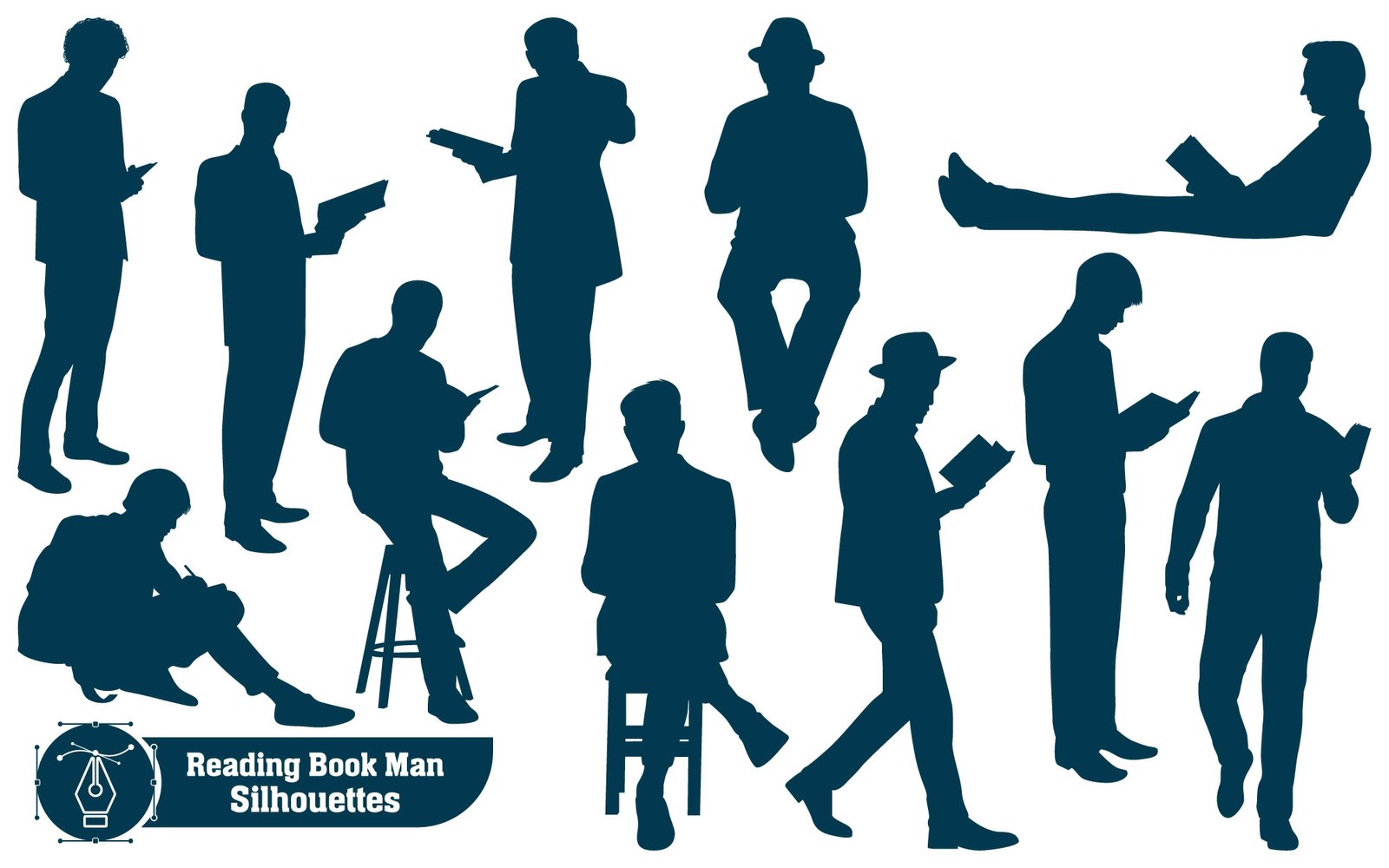 This comprehensive vector collection features diverse male silhouettes engaged in various reading activities. Men are depicted standing, sitting, walking, and reclining, all deeply immersed in books, tablets, or smartphones. This versatile set includes individuals focused on learning, studying, and absorbing information. Ideal for projects related to education, literacy, technology, lifestyle, and leisure. The crisp, clean outlines provide versatile visual assets for websites, presentations, posters, and print media, conveying concepts of knowledge acquisition, relaxation, and modern information consumption. The figures represent different ages and styles, making this a widely applicable graphic element for a broad range of design needs, emphasizing engagement with content in various everyday scenarios and environments. It is perfect for editorial and commercial use.
