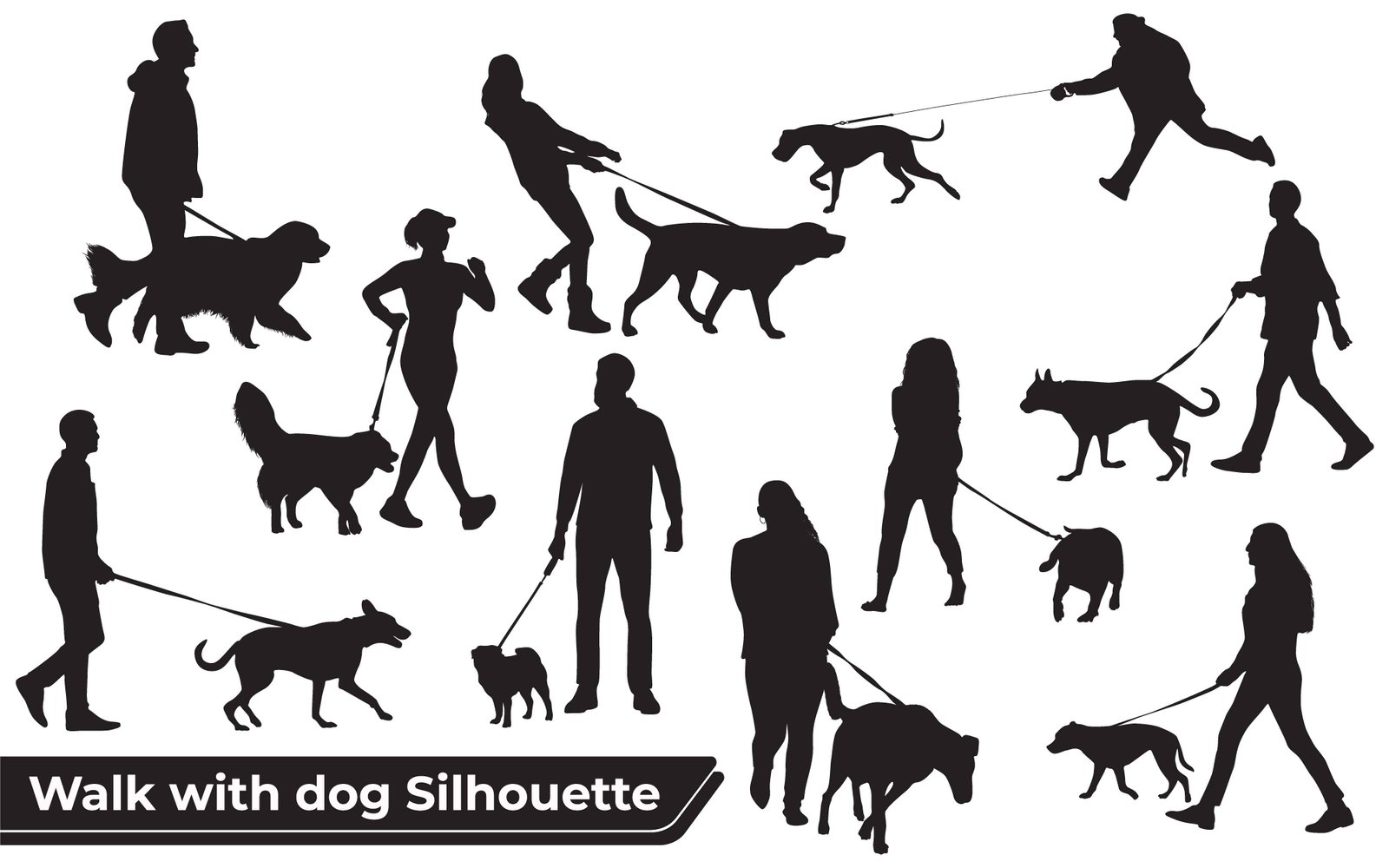 This extensive vector collection presents a diverse range of silhouettes capturing individuals, both male and female, of varying ages, engaged in the common activity of walking their dogs on leashes. The illustrations feature an assortment of dog breeds, from small companions to larger energetic canines, demonstrating different gaits and interactions between pets and their owners. These dynamic graphics are perfect for conveying concepts of pet ownership, exercise, companionship, outdoor lifestyle, and responsible animal care. Suitable for use in web design, print media, advertisements, educational materials, and infographics, offering clear, adaptable visual elements. The set emphasizes the routine joy and responsibility of having a canine friend and promoting an active life for both pet and owner.